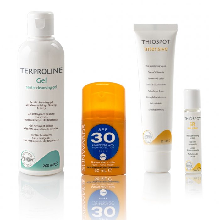 How To Use - AM & PMStep OneTerproline® Gentle Cleansing Gel: Use morning and evening at the start of your skincare routine to cleanse the skin to prepare for further steps.Step TwoThiospot® Intensive: For extensive dark areas, apply a small amount to the selected area and massage into the skin in the morning and in the evening. Cleanse and tone before applying. Moisturising cleansers may act as a barrier to absorption. Thiospot® is compatible with make-up. 30/60 day treatment.Step ThreeThiospot® Skin Roller: For best results apply the roller tip to the desired area and apply using a light pressure and a gentle massaging action twice a day. Leave skin to dry naturally before applying moisturiser or make-up. Cleanse and tone before applying. Moisturising cleansers may act as a barrier to absorption. Thiospot® is compatible with make-up. 30/60 day treatment.Please allow 4 to 8 weeks for Thiospot’s ingredients to be built up in the skin so to reach a level where results may start to show. Continue use until new lighter skin cells replace old, darker cells. This allows the lighter skin cells enough time to reach the skin’s surface as the darker cells are shed away. Results improve with continued use. Once skin is normalised, slowly withdraw the product.Step FourSunwards®: Apply all over the face and gently rub in until fully absorbed to protect the skin from UV exposure.Can Thiospot® be used as your main pigmentation treatment?Yes. The key ingredients change the skin to directly target the key melanin (pigment) making process but without damaging the skin's ability to make pigment long term. One should be wary of other products containing hydroquinone and hydroquinone releasing ingredients such as bearberry and arbutin containing creams.Can Thiospot® be used with other pigmentation treatments?We have found adding in other things like mild exfoliating cleansers and ascorbic acid (vitamin C) containing products can improve results further. Lastly for resistant pigmentation, we use clinic treatments for difficult situations.What is the real innovation of the pigmentation therapy with Thiospot® products?Thiospot utilises 4 ingredients synergistically. Each ingredient can work on its own to reduce pigment production and each works on a different stage of the pigment manufacturing process. The 4 ingredients together combine to give a result as good as a 4% hydroquinone cream but without the associated risks being reported with hydroquinone cream related to cancer.Can you buy individual packs of Thiospot®?Yes. However - Thiospot® Cream is for large pigmented areas like the forehead or cheek area and for conditions such as mask of pregnancy. Smaller marks can be treated effectively with the Thiospot® Skin Roller. If there are lots of small marks, consider the cream. Thiospot® normalises pigment production, it does not whiten skin. Combining the skin roller and applying to the slower reacting areas and then applying the cream can work synergistically and increase the results.How long does it take for Thiospot® to work?Thiospot® can start to reduce pigmentation around 4 weeks but may take 6 to 10 weeks.Can I use Thiospot® alongside other pigmentation treatments?Yes, but be aware of skin exfoliating products and combining them which can make the area sore.Are there any side effects with Thiospot®?Side effects are very rare. Some people may be sensitive to any ingredient so we always recommend patch testing for 48 hours. We rarely have a problem and if you do we will refund your money.Can I use Thiospot® while pregnant and breastfeeding?We have no data to support usage or not, and so it is not recommended.Who is Thiospot® designed for? (e.g. males, females, teenagers,)Thiospot is designed for pigmentation types whether it is sun damage, sun spots, age spots, melasma, or pregnancy mask. However different pigmentations can have different features and causes and one may need to vary their treatment programme.How long will the products last?In average we get repeat purchases every 8 weeks.Will Thiospot® work?Thiospot is a highly effective pigmentation treatment and works in over 75% of those who use it, and works for the long term. 25% get complete resolution and can stop using once the pigmentation has gone. 25% it will reduce almost completely and one can stop usage and it will remain almost clear (clear so no-one else would notice) and in 25% of people it reduces it effectively but if one stops using Thiospot it will come back and so a maintenance dose is needed to keep the area clear.Has it been tested on animals?None of the products have been tested by us or the manufacturer on animals. This is important to us and the research company behind the products.Does Thiospot® contain Parabens?No parabens of any sort are used as a preservative in Thiospot or any of the company’s products.Is Thiospot® safe to use in the sun?Thiospot® is safe to use in the sun. Ensure that the Thiospot® is completely absorbed. Once fully absorbed, it is essential to apply a high factor sunscreen such as the Sunwards®.